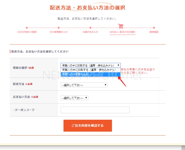 ラクポは年賀はがきの持ち込みも可能です。最終の注文画面で「年賀はがき持ち込み」を選びます。