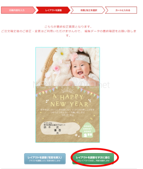 年賀状のレイアウト最終確認になります。文字や写真の配置に間違いがないか確認しましょう!
