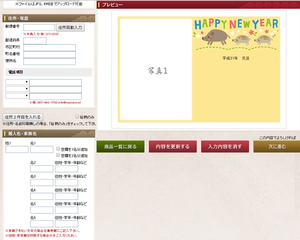 特にいのししイラストと写真を組み合わせての年賀状印刷ならプレビューでしっかりバランスを整えましょう!